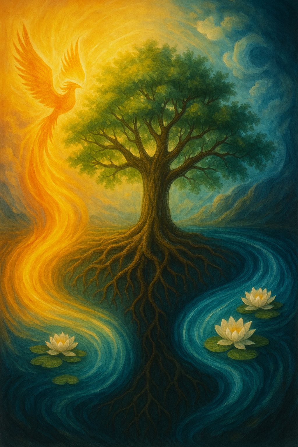 It begins in the body and rises into awareness, only to fall again into the heart. It does not reject longing—it honors it. It does not deny form—it sanctifies it. It does not grasp at the sky or collapse into the ground. It stands, like a tree, rooted and reaching, fed by both earth and sun.